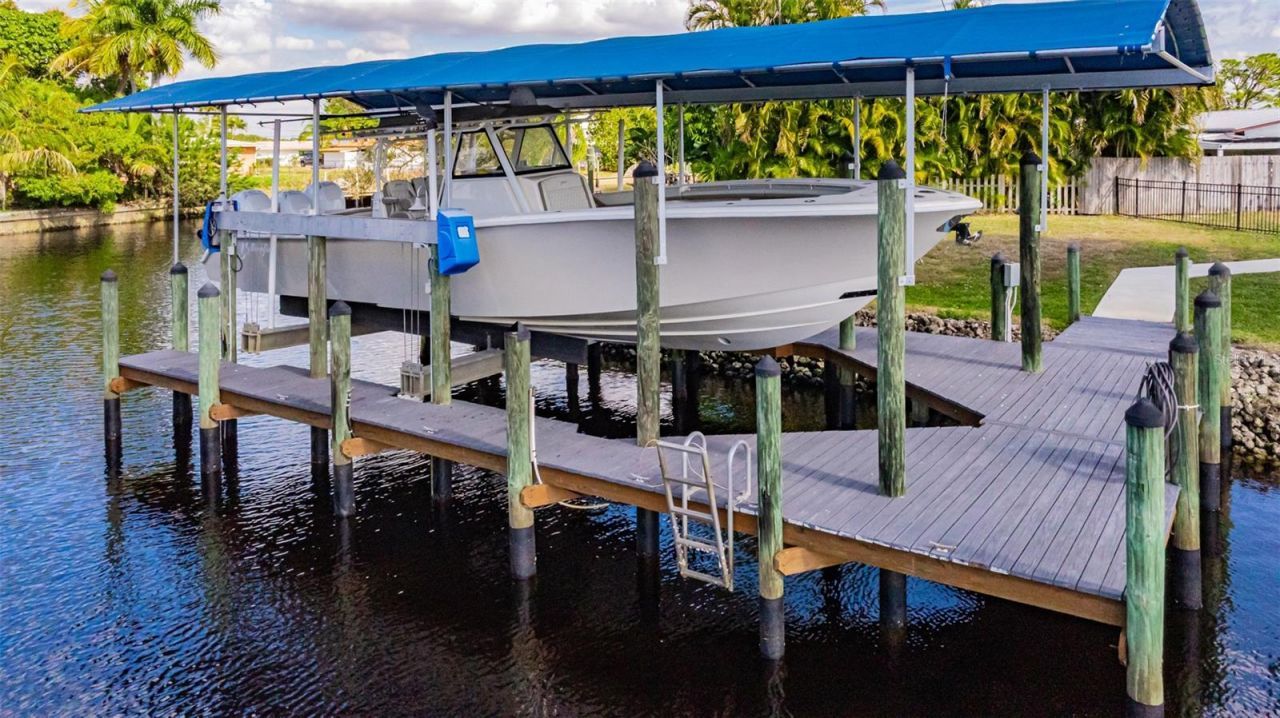 Sitting on a canal just seconds away from the main river with direct access along with a 30k lb covered boat lift, this beautifully renovated 2 bedroom, 2 bath waterfront home is the perfect haven for boaters. This home has been impeccably renovated, with the interior featuring a fully custom kitchen with an expansive island, newly updated master and guest bathrooms, impact windows and doors throughout, and a gorgeous cathedral ceiling with exposed wood beams. Beyond the 30k lb lift, the exterior features a metal roof (2018), a fenced-in yard, a private patio area, and built-in industrial grade metal flood barriers. The surrounding River Forest community is a volunteer HOA and features a club house and community boat ramp. Don't miss your chance to own this boaters paradise!