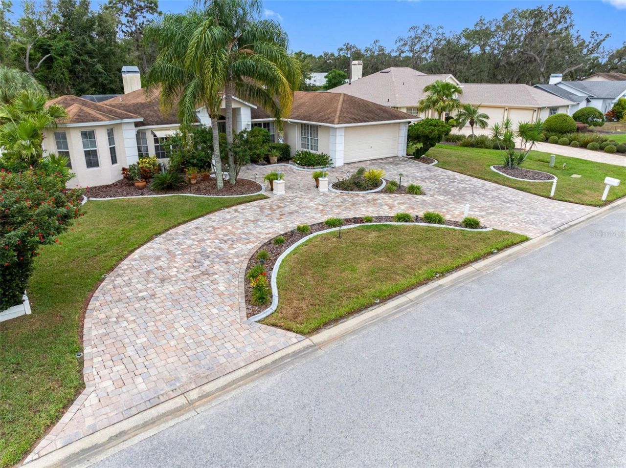 Arrive home to a private executive estate framed by lush landscaping and a welcoming circular drive. A new 30 yr dimensional roof installed 2/16/26 adds peace of mind and private pool retreat with a resurfaced pool (2025) creates the perfect setting for entertaining, and making memories. The outdoor oasis is complemented by an outdoor shower, gazebo, custom BBQ grilling station, and sun shade making a perfect space for both serene afternoons and lively gatherings. Inside, the home opens to a grand entryway where elegant travertine tile floors and natural stone accents set a tone of sophistication. The expansive living area is welcoming with natural light, electric fireplace, and French doors leading to the pool and scenic backyard views. The great room really makes a statement with a vaulted ceiling, skylight, stone accent electric fireplace, and refined mantle. The kitchen is a chef's delight, featuring granite countertops, upgraded dual sink with filtered water, under-cabinet lighting, accent molding, and a bright breakfast nook overlooking the pool. The spacious master suite offers the perfect blend of luxury and privacy with his-and-hers walk-in closets and a spa-like en-suite bath complete with dual sinks. Whether beginning or ending your day, this elegant retreat ensures comfort and serenity. The third bedroom is ideal for guests or multi-generational living, featuring its own private access door to the pool and lanai-a rare setup that makes it perfect for use as an in-law suite or private guest quarters. The dedicated office provides even more flexibility, with two closets, upgraded lighting, extra storage, and a nearby third bath. Additional features include integrated blinds on all exterior doors, ADT security, inside laundry with washer and dryer, and a fully fenced backyard with extra storage shed. This property is more than a home-it's a lifestyle, offering a rare blend of elegant finishes, versatile living spaces, outdoor enjoyment of tranquil country surroundings, all wrapped in this stunning executive estate.